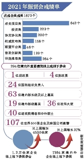 新京报讯 (记者陈琳)9月7日,2021年中国国际服务贸易交易会闭幕,商务部服贸司二级巡视员王志华介绍,本届服贸会办出了特色、办出了成效、办出了质量,交出一份喜人的成绩单。据初步统计,截至9月7日16时,本届服贸会达成各类成果1672个,“参展参会企业数量和国际化程度均超过上届水平。”