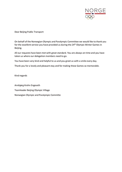 2月14日,在北京冬奥村运动员班线开通的第23天,北京公交集团北京赛区巴士团队B2车队收到一封感谢信。这封信以“挪威奥运会和残奥会委员会”的名义,致谢北京公交的每一位员工。
