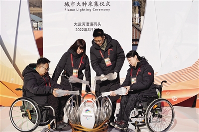 3月2日,北京冬残奥会火种采集仪式分别在北京市盲人学校、望京街道温馨家园、中国盲文图书馆、大运河漕运码头、八达岭古长城、张家口“创坝”园区、张家口黄帝城、天坛公园举行。这些火种采集地涵盖了北京、延庆、张家口3个赛区的学校、社区、图书馆等助残地标,具有代表性的历史文化地标和现代科技园区,以及2008年北京夏残奥会的火种采集地等。每个火种采集后还在采集地进行了城市火种火炬传递。