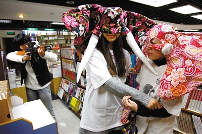 昨日,北京三联书店内,3名志愿者用人偶剧的方式,向读者展示非洲草原偷猎者残杀大象的过程。当日,国际爱护动物基金会为读物《大象罗拉》举办发布仪式,这套图书呼吁人类爱护动物,保护人与动物共同的家园。本报记者 郭铁流 摄影报道