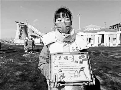 白欣妍的妈妈告诉北京青年报记者,孩子最期待的就是偶像大哥哥苏翊鸣的决赛。在2021年3月与苏翊鸣的往来信件中,苏翊鸣许下了“为国争光”的铮铮誓言。而白欣妍也在苏翊鸣比赛当天来到首钢滑雪大跳台,举着自己精心绘制的手抄报,带动前来观看赛事的观众积极为大哥哥喝彩助威,以志愿行动为苏翊鸣加油。