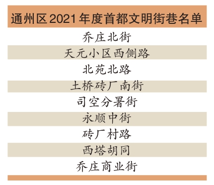 通过背街小巷环境整治和文明创建,小胡同不仅提升了“颜值”,还内外兼修,文明程度也不断提升。日前,北京市召开背街小巷环境精细化整治提升动员部署大会,公布了一批具有首都风范、古都风韵、时代风貌的文明街巷,其中北京城市副中心的乔庄北街、天元小区西侧路等9条街巷获得2021年度首都文明街巷称号。