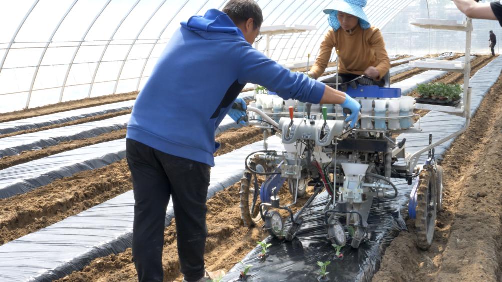 在作业展示环节,一名熟练的机手驾驶拖拉机一次性轻松完成地块的旋耕、起垄、铺管、覆膜作业,垄面平整、垄型整齐,起垄覆膜一体机高质高效完成棚内耕整地任务。而西瓜秧苗移栽环节,技术人员在现场对双行移栽机简单讲解并指导后,由两名从未用过设备的工人进行机栽作业,简单易上手的操作方式让新手也能高效完成定植任务。移栽机栽植株距30cm,行距40cm,亩栽植量可达到2100株。两台设备极大地降低了作业时间及人工人力投入,作业质量和作业