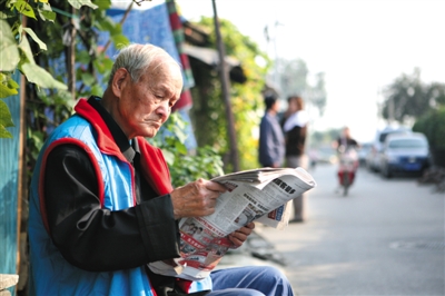 ▶西草市街,付漪泉生前在阅读新闻报纸。资料图