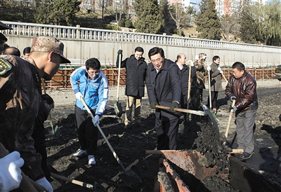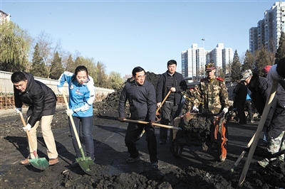 新京报讯 (记者李相蓉)昨日,南护城河广渠门桥至东便门桥河段进行清淤工作,市委书记郭金龙,市委副书记、市长王安顺与志愿者、市民代表、部队官兵等300余人一起挥锹铲泥,共同清理南护城河内积了9年的淤泥,拉开水环境治理清淤志愿义务劳动的序幕。