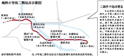 地铁6号线一期工程西起海淀五路居站,东至朝阳草房站,已于2012年开通。6号线二期线路全长12.4公里,全部为地下线,共设车站8座,自西向东依次为物资学院路站、通州北关站、通运门站、北运河西站、北运河东站、郝家府站、东夏园站、潞城站。其中通州北关站、通运门站为换乘站,实现与远期规划的R1线、S6线的换乘。据介绍,6号线二期车站站名方案将在报请市政府批准后发布实施。
