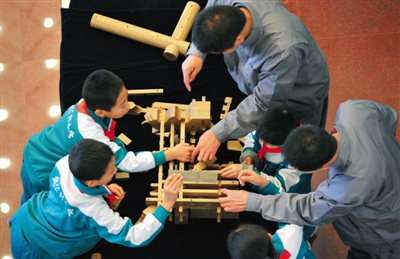 昨日,小学生们在工作人员的指导下亲手搭建古建模型。新京报记者 薛珺 摄