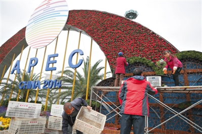 10月21日,怀柔城区,工人们在摆放安装APEC花坛。新京报记者 侯少卿 摄