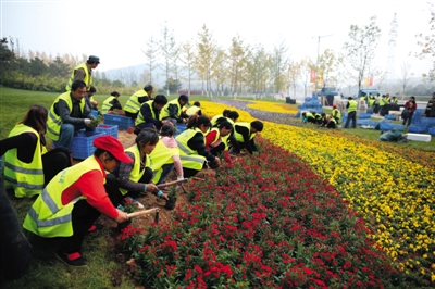 10月20日,怀柔雁栖湖,在通往雁栖岛的道路两旁,工人们在加紧摆放花坛。新京报记者 侯少卿 摄