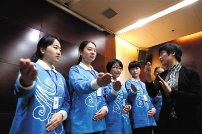 其中,礼仪培训有针对性地从妆容塑气质、站坐出风景、微笑传友善、眼神有礼数四个方面进行。培训时,志愿者需要经常对着镜子练习微笑,或者互相对着演练,看怎么笑得标准笑得美。