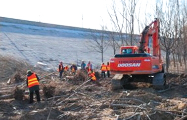 大宁调蓄水库工程现场,工人正在伐移树木。图片来自北京市南水北调办官网
