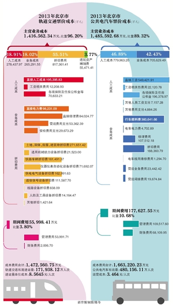 数据显示,2013年北京市公交运营总成本为166.32亿元。当年公交客运总量为48.02亿人次,每人次运营成本为3.464元。
