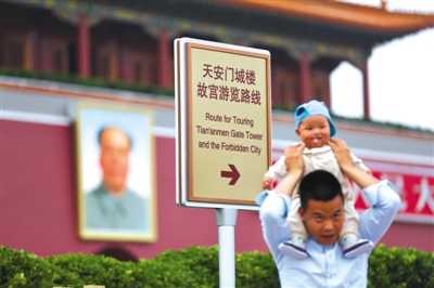 昨日,游客在一块新的导视牌前留影。近日,天安门地区首批安装80余块导视牌,包括全景导览图、警示牌、指示牌等。新京报记者 浦峰 摄