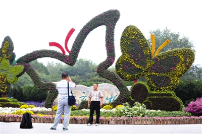昨日,北京植物园,游客在菊花组成的“蝴蝶”前留影。9月25日至10月25日,北京植物园第6届北京菊花文化节将在北京植物园拉开帷幕。 新京报记者 浦峰 摄