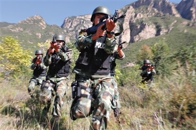 昨日,武警北京总队4支防暴小分队在京郊实弹演练,队员携带武器进行丛林搜索。通讯员 王双战 摄