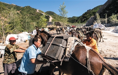 9月10日,工人们用骡子运送长城修葺工作用砖。新华社记者 张宇 摄