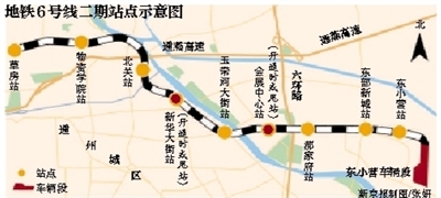 地铁6号线是一条贯穿中心城的东西向轨道交通骨干线,一期工程西起五路居,东至草房站,已于2012年开通;二期工程共设8座车站,分别是物资学院站、北关站、新华大街站、玉带河大街站、会展中心站、郝家府站、东部新城站和东小营站。