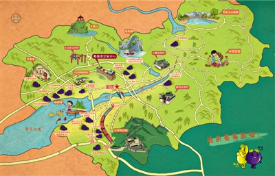 据延庆县相关负责人介绍,这份手绘地图,正面以绿色格调为主,图中的人物和标志建筑,都选用漫画方式。