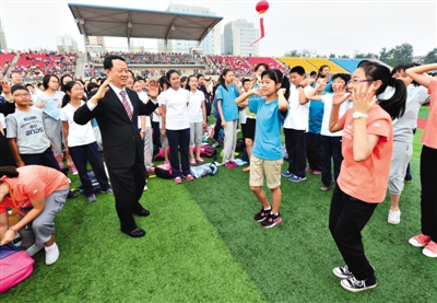 昨天8时30分,北京十一学校开学典礼在学校运动场举行。央视名嘴撒贝宁现身演讲,随后,校长李希贵带领师生跳起改编版《小苹果》,现场气氛活跃。