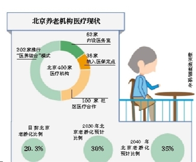 “医养结合”是北京养老服务的难点。北京市民政局副局长李红兵透露,北京目前400家医疗机构,仅有62家机构内设医务室,其中有36家纳入医保定点,另外还有100家养老机构和周边的诊所、社区医疗服务站有合作,为老年人提供医疗服务。“另外200多家就是今后重点推行‘医养结合’模式的单位。”