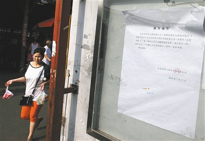在张贴着的“撤市通告”上,写明产权方与出租方经过协商,于2014年7月9日解除租赁合同,定于2014年9月30日晚8点关闭四环市场。在另一份公告中,西城区城管局要求市场违建的搭建、使用人自行拆除和腾空违建,拒不拆除将予以强制拆除。