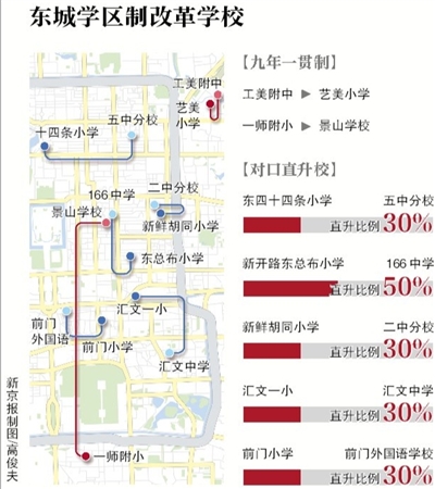 新京报讯 (记者黄颖 实习生李丹)在2014至2015学年度,东城区启动的新一轮学区制综合改革实验项目中,将新增两所九年一贯制学校,并新建11对深度联盟校,其中有5对学校将按比例对口直升。其中“小升初”对口直升比例至少达30%。