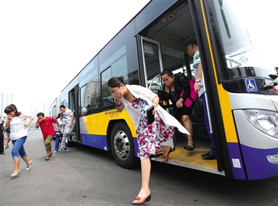 昨日,朝阳区康家沟95路车站开展公交车反恐防暴演练,公交司售人员疏导“乘客”从公交车前后门下车。新京报记者 王贵彬 摄