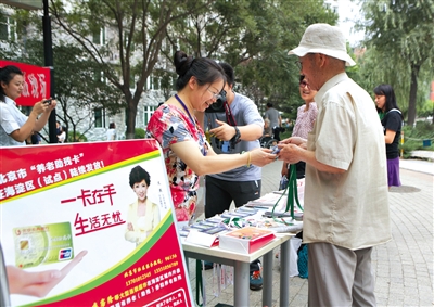 昨日,北京市养老助残卡发卡处,一名老人正在领卡。7月1日起,北京市养老(助残)券变卡工作启动,并在海淀试运行。新京报记者 周岗峰 摄