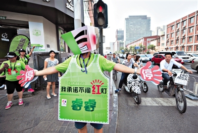 昨日,朝阳区红庙路口,一位志愿者在路边提醒市民不要闯红灯。未来一个月内,朝阳区将在红庙路口至青年路路口全长3.5公里的道路上,打造北京首条“零闯红灯”示范路,市民可通过“文明朝阳”官方微博、扫描二维码等方式报名参与志愿执勤。此次公益活动主要分为早晚执勤、日常活动两部分。7月8日至8月7日每日早7点至9点、晚5点至7点,两个高峰时段志愿者将在示范路指定路段执勤。新京报记者 薛珺 摄影报道