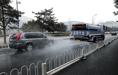 今年2月21日,国家大剧院,环卫洒水车在进行喷雾作业,降低近地面粉尘,减轻雾霾影响。新京报资料图片 薛珺 摄