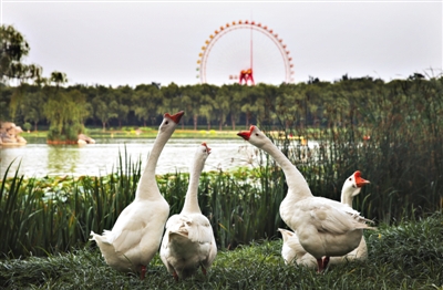 昨日,龙潭西湖西岸,一群大白鹅在湖边“曲项向天歌”,远处,北京游乐园的摩天轮俨然是这附近的地标。 新京报记者 尹亚飞 摄
