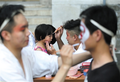 昨日,颐和园内,京剧演员为游客画脸谱。新京报记者 薛珺 摄