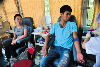 参加义务献血的志愿者高女士(左)和男朋友一同献血,并且做了造血干细胞捐献登记。昨天上午举行的“我学榜样做公益”世界献血者日志愿活动上,一小时内就有31位市民登上献血车,捐献了60个单位的全血。新京报记者 吴江 摄