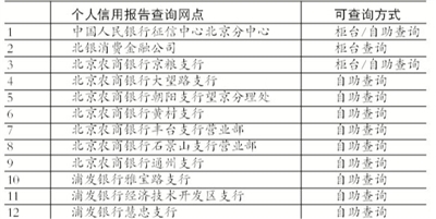 自助查询机目前可免费查询两次信用报告,第三次及以上需要到央行征信中心北京分中心(月坛北街26号恒华国际商务中心A座907)、北银消费金融公司(中关村大街22号中和大厦B座1层)、北京农商银行京粮支行(东三环中路16号京粮大厦一层)三个网点进行人工查询。