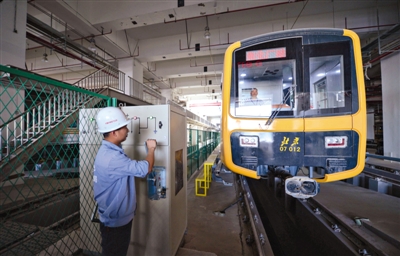 昨日,地铁7号线焦化厂车辆段,工作人员开始调试运行车辆。新京报记者 侯少卿 摄