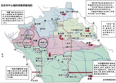 “西蓄”是利用西郊的一些砂石坑,还有如玉渊潭公园等一些蓄水湖面,把水稍微蓄制一下,缓解西山的洪水进城,起错峰或调峰的作用,最终向东排。南北分洪是指通过护城河,让雨水分别通过右安门和安河闸将西边的水排向凉水河和清河。