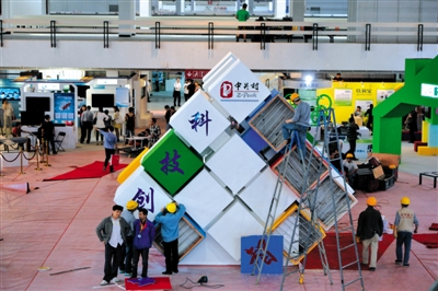 昨日,工作人员在科博会展馆内布置展台。第十七届北京科博会,将于今日至18日在老国展展出。新京报记者 吴江 摄