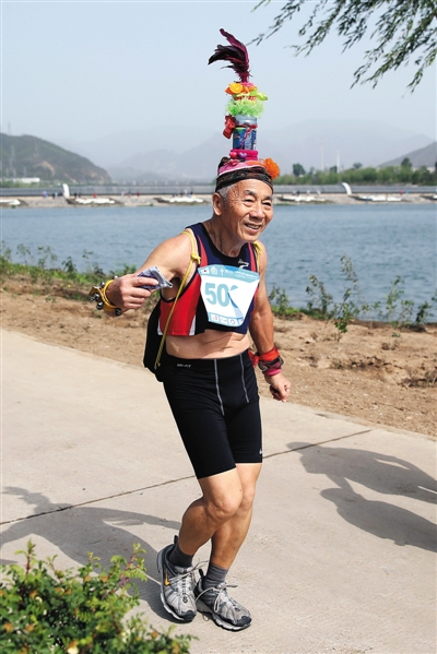 一参赛老人将装饰过的饮料瓶顶在头上。