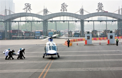 昨日,大广高速河北固安段,警方和医务人员将被解救的“受伤人质”送上警用直升机。图/东方IC