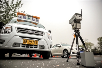 4月2日,天津市区,汽车尾气遥感监测车正在工作,车辆以正常速度通过即可监测尾气是否达标。新京报记者 李飞 摄