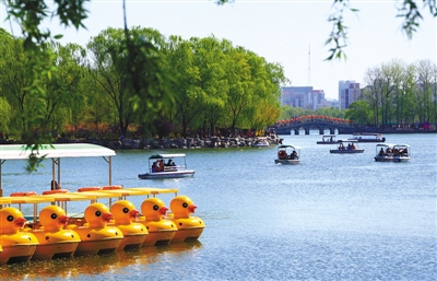 4月3日,玉渊潭公园湖面游船在穿梭。清明节期间玉渊潭共有300余条游船供游客泛舟。拍者 午后岩茶