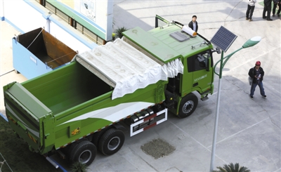 新标准全封闭渣土车首次亮相。昨日,市住建委、市环保局、市市政市容委联合启动全市工地扬尘治理专项行动。从7月1日起,北京所有工地都要使用新标准的渣土运输车,车辆要安装北斗定位系统,随时可以监控运输线路和倾倒地点。