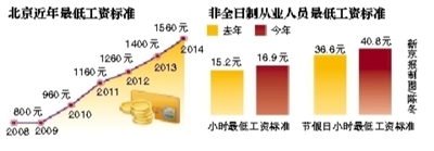 新京报讯 (记者温薷)昨天起,北京再次提高最低工资标准,由目前每月的1400元调整为1560元,增加160元,增幅为11.4%,略高于去年11.1%的增幅。和2010年7月前最低工资800元标准相比,近4年已接近翻番。