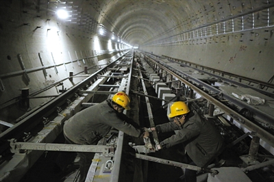 昨日,地铁14号线将台站主体结构已完工,工人在轨道上施工。 新京报记者 侯少卿 摄