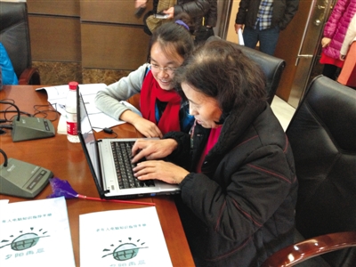大学生志愿者在牡丹园社区教老人如何使用电脑。新京报记者 刘春瑞 摄
