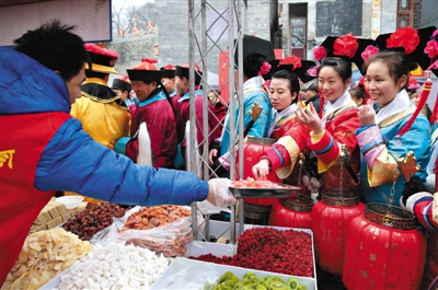 昨日,八大处庙会,“宫女”们在争尝小吃。八大处新春祈福庙会在“消失”了百年之后,今年再次与百姓见面。据历史资料和图片资料的记载,历史上西山八刹的庙会热闹非凡,特别是灵光寺、香界寺、福惠寺、姚家寺等多座寺庙历史悠久,庙会鼎盛。今年从正月初一到十五,游客在八大处可体验到百年前原汁原味的老北京庙会文化。活动期间,包括新年祈福大法会、灵光普照福门开、十三档花会拜庙走会、北京最大的“打金钱眼”等十七项主题系列活动,将使八大处庙会精彩不断。新京报记者 郭延冰 摄