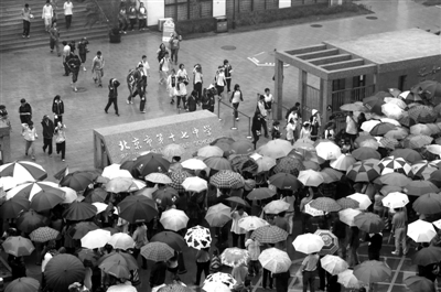 2013年6月7日,高考语文考试结束后,众多家长打着雨伞在雨中等待考生走出考场。新京报记者 王贵彬 摄