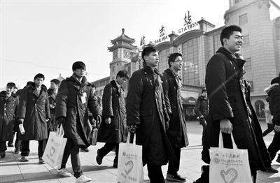 1月16日,学生志愿者们在北京站列队上岗。当日,2014年春运拉开大幕。来自天津铁道职业技术学院的学生志愿者们,在各自的岗位上迎接考验。今年春运期间,该校有410多名学生到北京站、北京铁路客户服务中心、天津站等地志愿协助售票、验票、引导、话务等工作。 新华社发