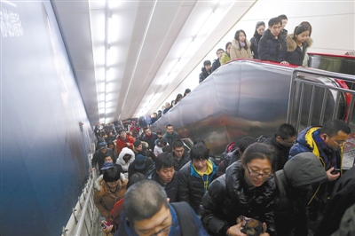2013年12月18日,10号线国贸站,晚高峰下班的市民在站内换乘。针对地铁调价,昨日有政协委员提出,高峰时段可提高票价。新京报记者 侯少卿 摄