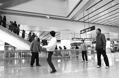 昨晚8时,北京南站地下一层大厅内,一些市民聚在一起踢毽子健身。对此,站方表示客流高峰期会禁止居民入内锻炼。新京报记者 王叔坤 摄